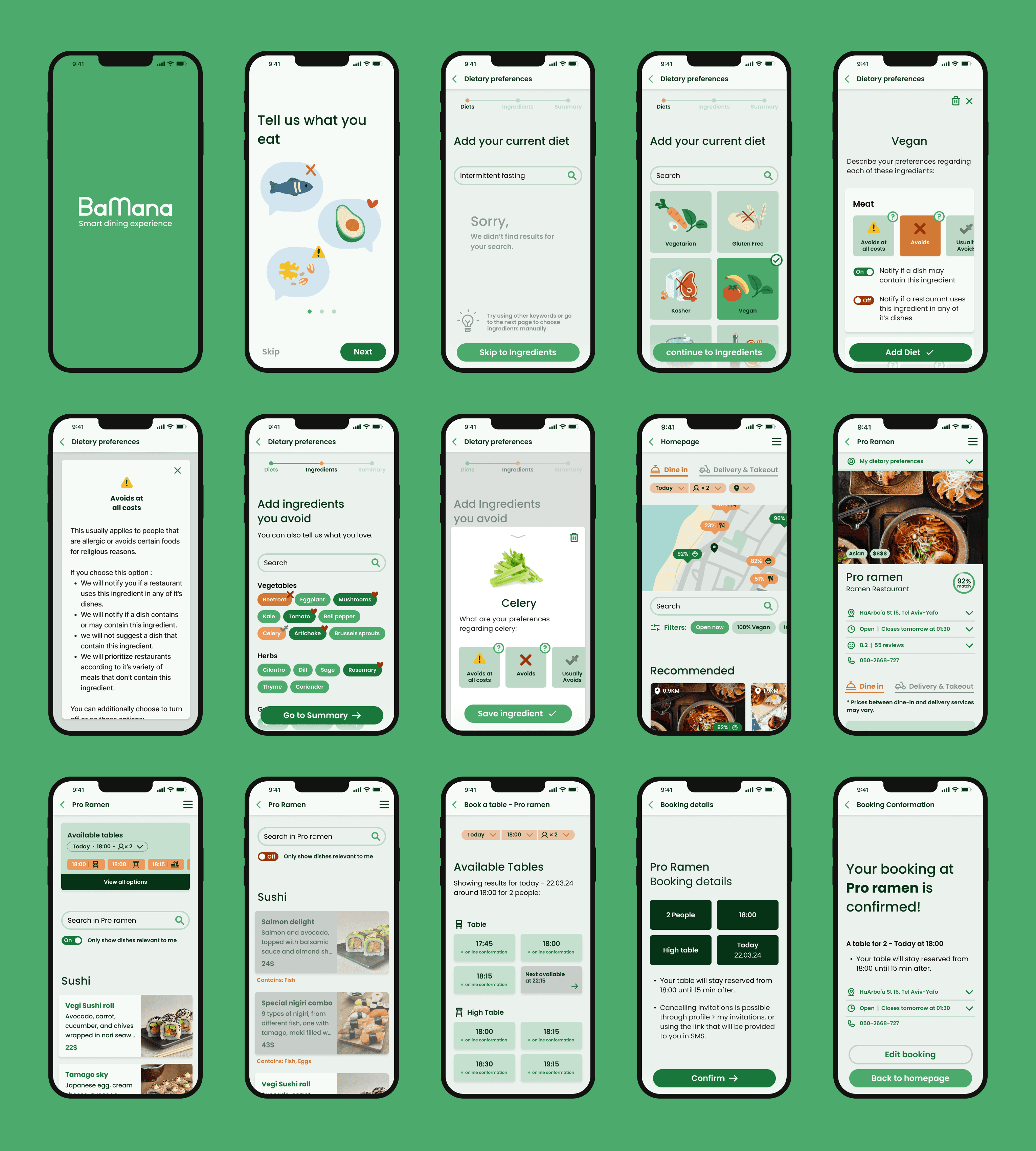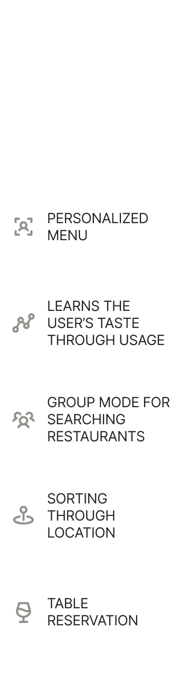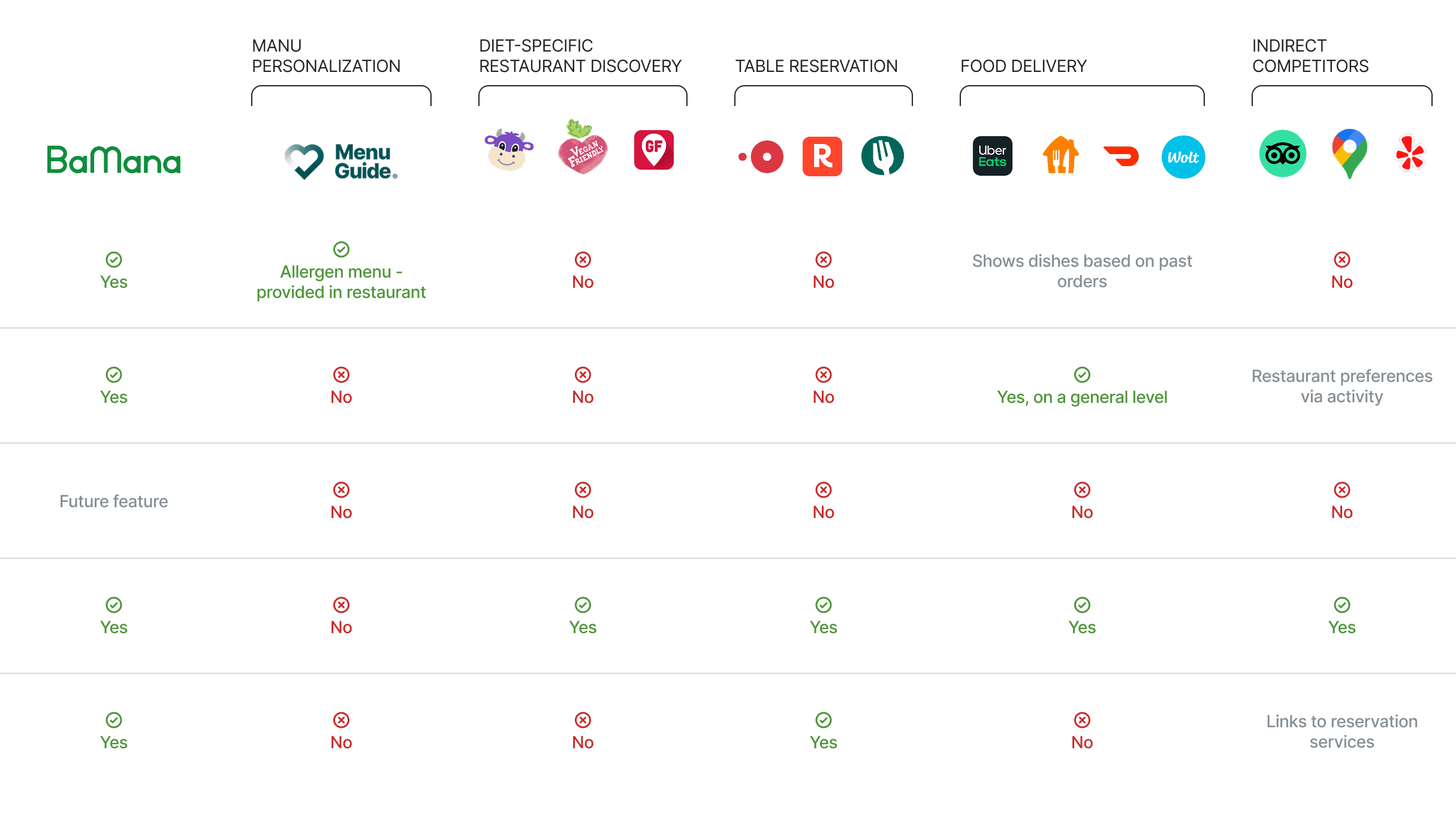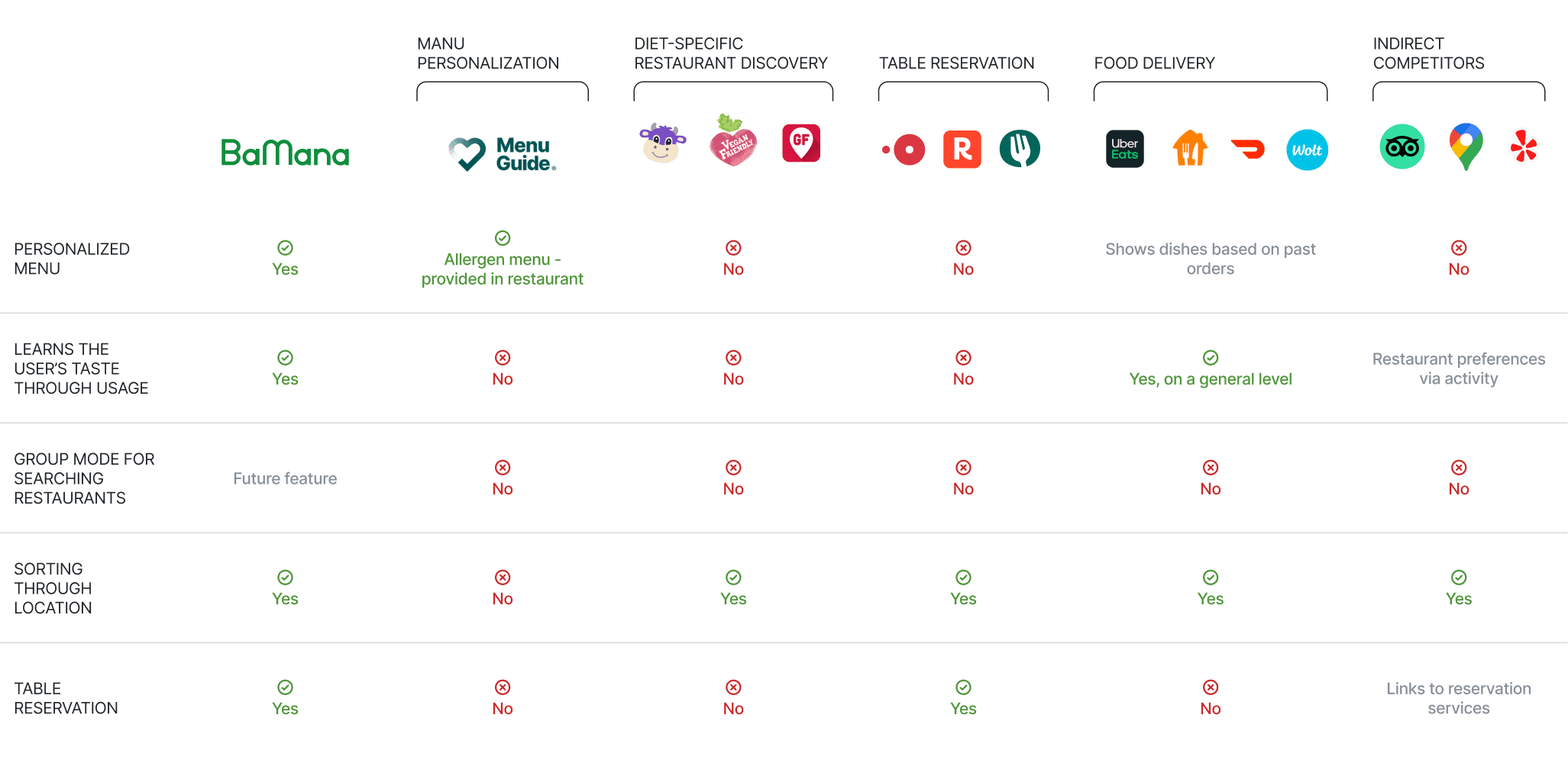 The biggest conclusion from our analysis was that none of the companies provided users with restaurant or dish suggestions that where deeply focused on their personal taste. Most suggestions where general: like favourite cuisines or general dietary restrictions.