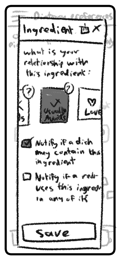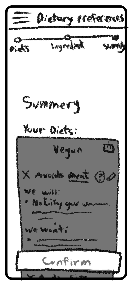 To filter out dishes by their ingredients, we would need restaurants to enter what each dish contains. One of our concerns was they wouldn't be willing to do so, to our surprise none of them saw it as a problem.